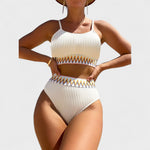 Este biquíni de duas peças em tecido canelado traz o equilíbrio perfeito entre sofisticação e autenticidade. O branco clássico é realçado por um bordado étnico em ziguezague nos acabamentos, criando um contraste vibrante e cheio de personalidade. O top tipo cropped com alças finas e a cueca de cintura subida oferecem suporte, conforto e um toque retro-chique, ideal para quem quer destacar-se com discrição elegante nas suas escapadelas de verão.