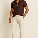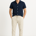 Este conjunto coordenado de camisa e calças inclui uma camisa de manga curta com colarinho clássico e calças de corte estreito com cintura elástica. O design visa oferecer um aspeto arrumado enquanto permite fácil movimento.