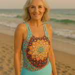 O modelo Erica foi pensado para mulheres que querem sentir-se elegantes e confortáveis, mesmo com uma barriguinha mais suave. O top solto e leve disfarça delicadamente a cintura e o abdómen, enquanto as cuecas garantem um ajuste perfeito sem apertar. A vibrante estampa mandala chama a atenção para cima e dá-lhe um visual fresco e cheio de energia.