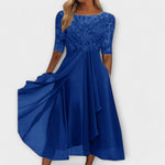 O nosso vestido especial para convidadas de casamento, com uma silhueta de comprimento médio, um corpete lindamente bordado e mangas curtas, é a escolha perfeita para qualquer ocasião festiva. Disponível em azul, verde, roxo, cinzento, azul escuro, rosa e bege, este vestido oferece elegância e conforto para qualquer evento.