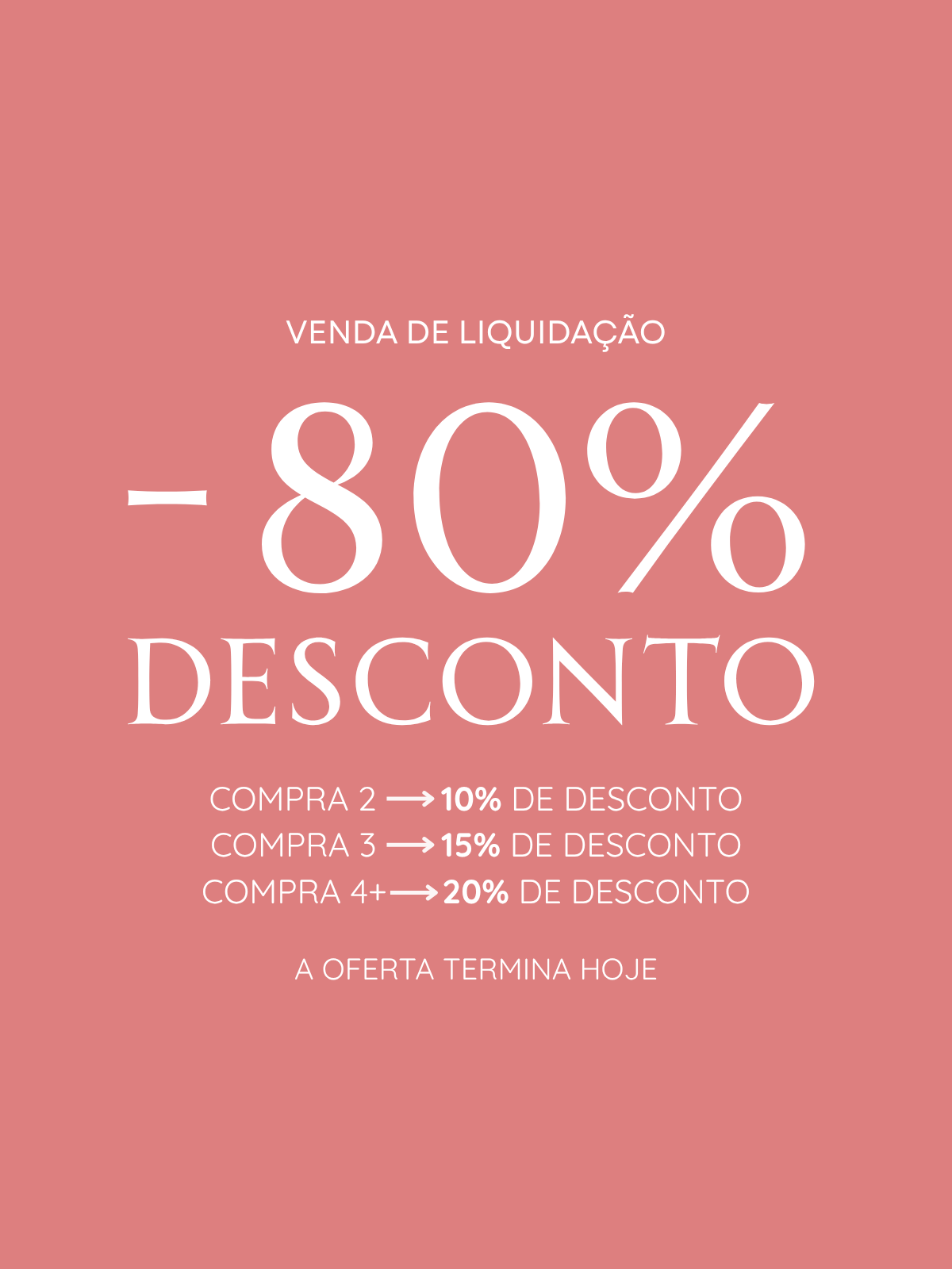 Estamos quase a esgotar. Para acelerar o processo de liquidação, aproveite os descontos finais de até 80%, aplicados automaticamente no checkout.