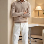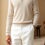 Este sweater de malha com zíper de um quarto apresenta uma gola alta e um fecho de zíper. O corte regular permite espaço para uma camada base, mantendo uma silhueta arrumada. A construção em malha oferece elasticidade flexível e estabilidade estrutural para uso repetido.